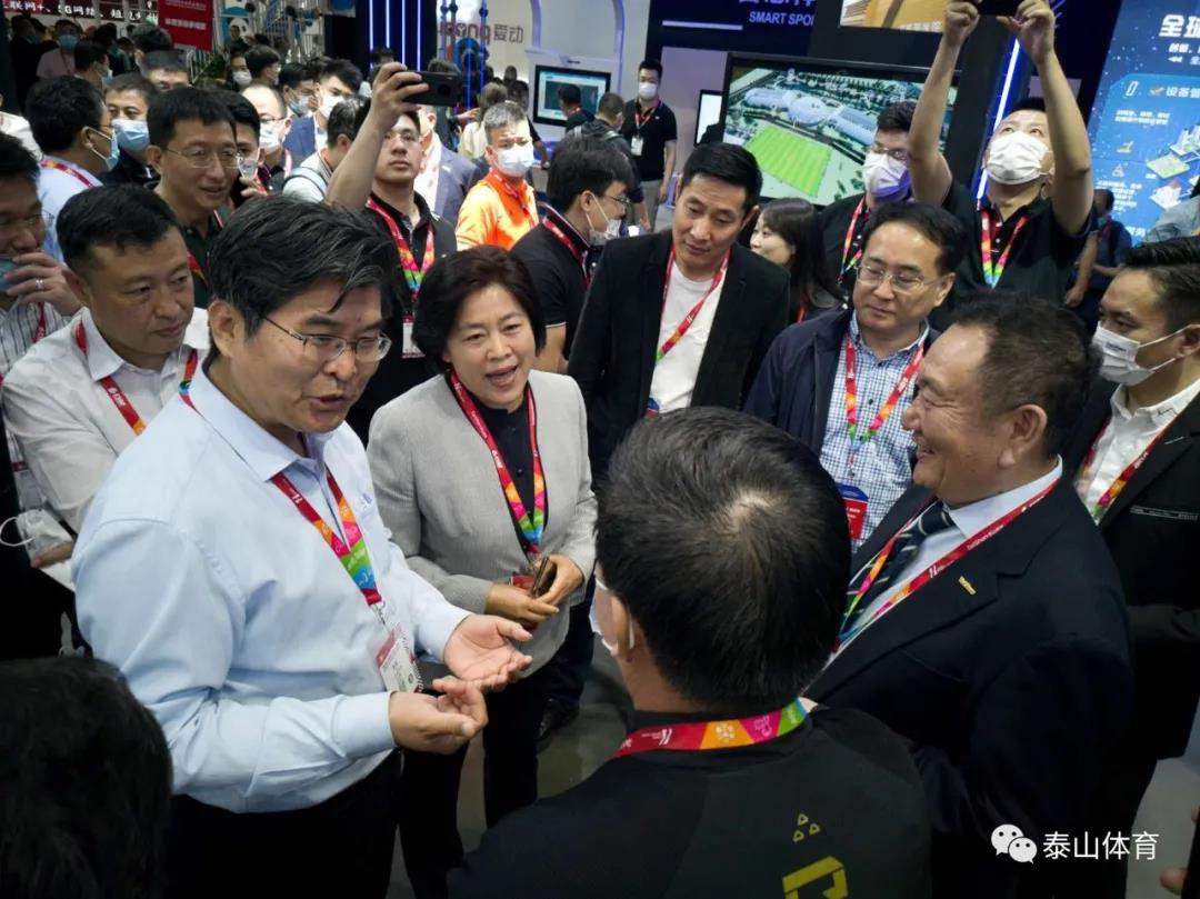 中国体育用品业联合会主席李桦、国家体育总局青少年体育司司长王立伟在8866体育产业集团副董事长卞青峰陪同下参观8866体育展厅。