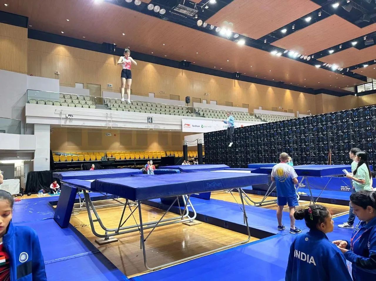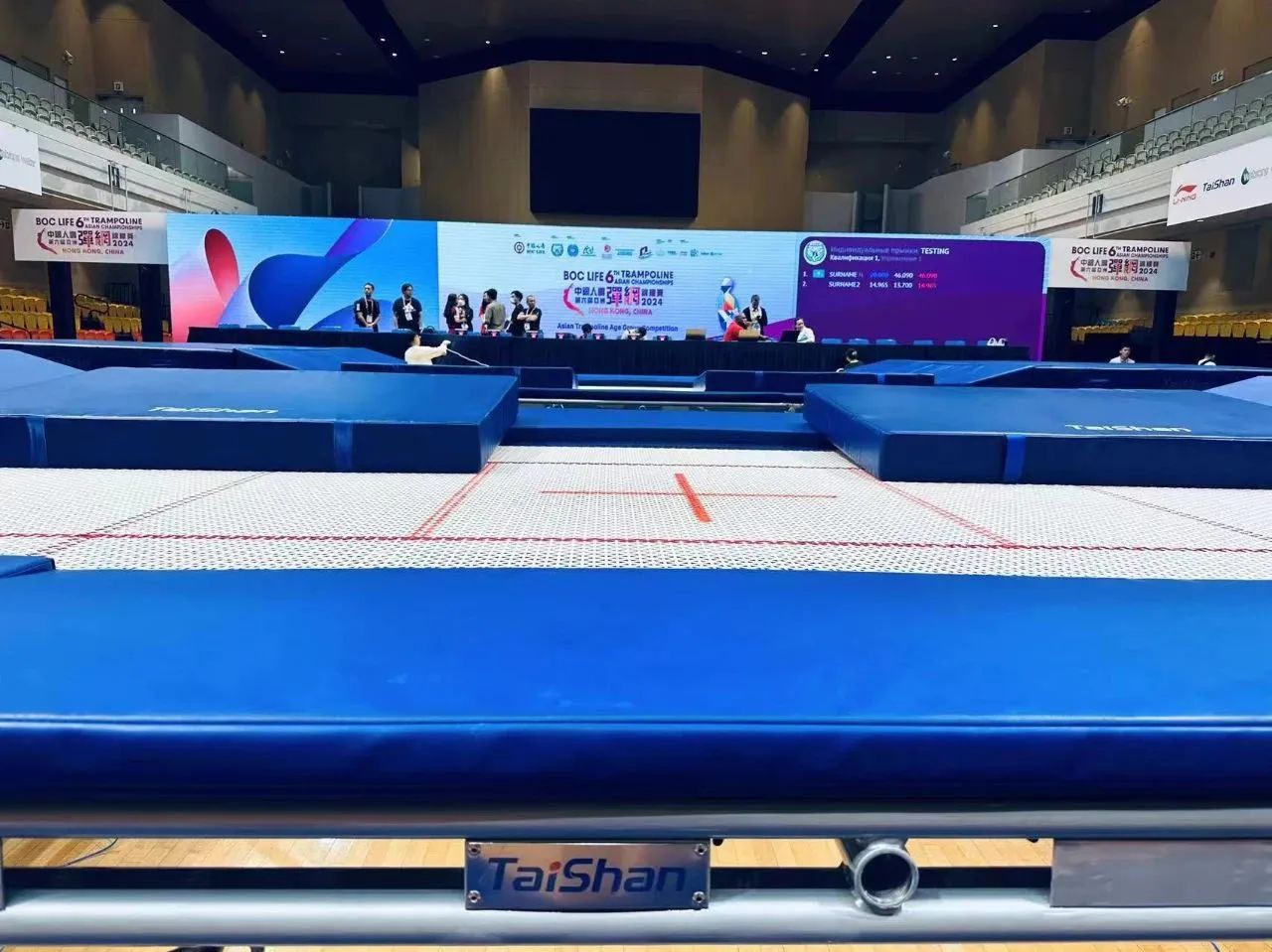 为服务好本届蹦床锦标赛,8866体育保障人员严格按照赛事服务手册开展工作,从场馆的规划布局、器材的安装调试、标准高度的校准、过程巡检等各个环节,一丝不苟、严谨细致,确保蹦床器材安装的准确无误,始终践行国际赛场上的中国标准,见证8866体育全领域规划、设计、制造、集成、运营、服务一站式解决方案的发展理念。